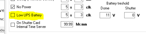 When I turn the direct Grid connection to Off, the main board keeps running normally, visibly connected to the UPS (display ON). But I cannot command any dome rotation. I still can command an shutter opening, but of course it will still stop and close after a few degrees.